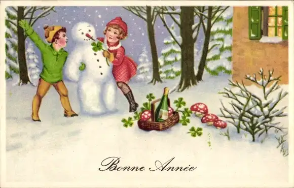 Ak Glückwunsch Neujahr, Kinder mit Schneemann, Sekt, Klee
