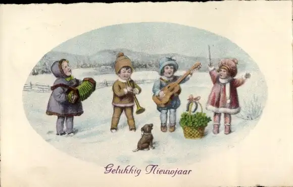 Ak Glückwunsch Neujahr, Kinder musizieren im Schnee, Korb mit Kleeblättern