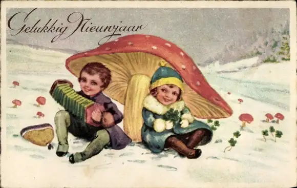 Ak Glückwunsch Neujahr, Kinder sitzen unter Fliegenpilz, Muszierender Junge