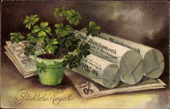 Ak Glückwunsch Neujahr, Kleeblätter, Reichsmark, Geldrollen, Geldscheine