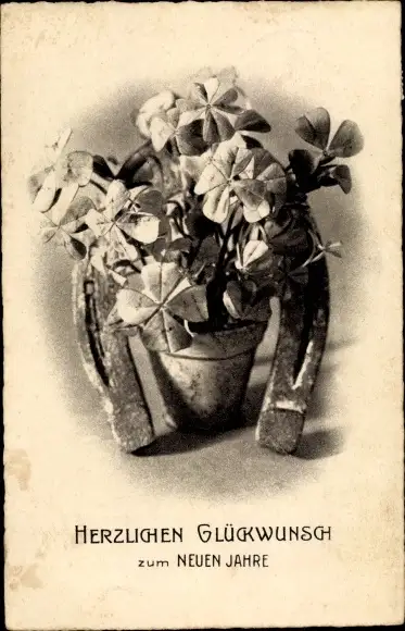 Ak Glückwunsch Neujahr, Kleeblätter in einem Blumentopf, Hufeisen