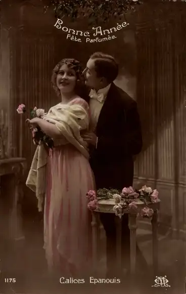 Ak Glückwunsch Neujahr, Liebespaar, Mistelzweige, Blumen