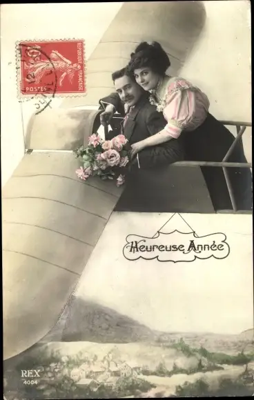 Ak Glückwunsch Neujahr, Liebespaar im Flugzeug, Blumenstrauß