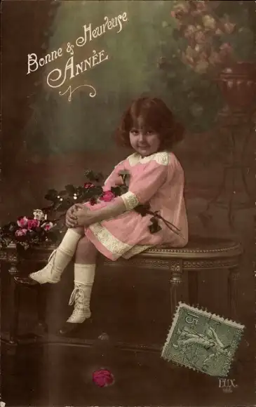 Ak Glückwunsch Neujahr, Mädchen, Blumen, Tisch