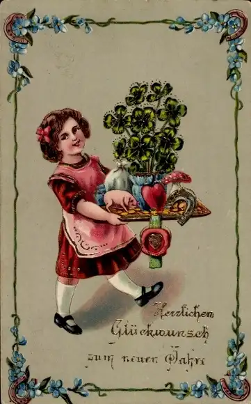 Ak Glückwunsch Neujahr, Mädchen, Glücksklee, Hufeisen, Schwein, Vergissmeinnicht