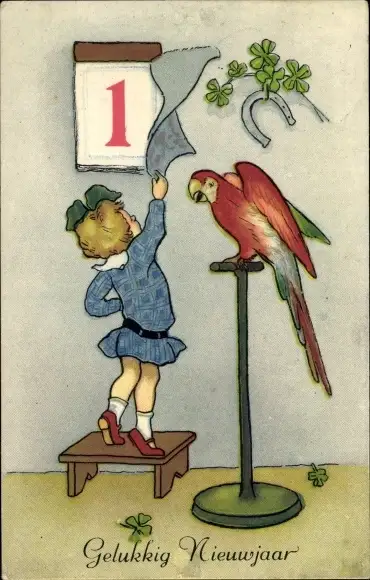 Ak Glückwunsch Neujahr, Mädchen, Kalender, Papagei, Hufeisen, Kleeblätter