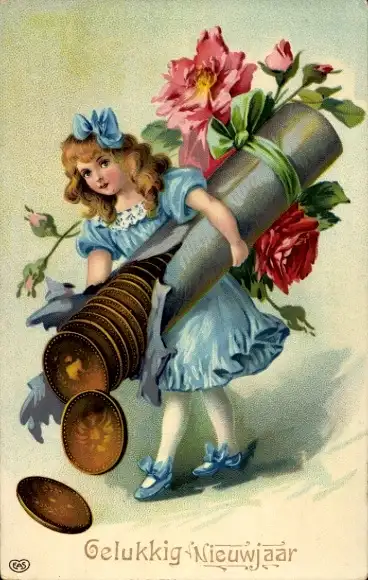 Ak Glückwunsch Neujahr, Mädchen, Münzen, Blumen