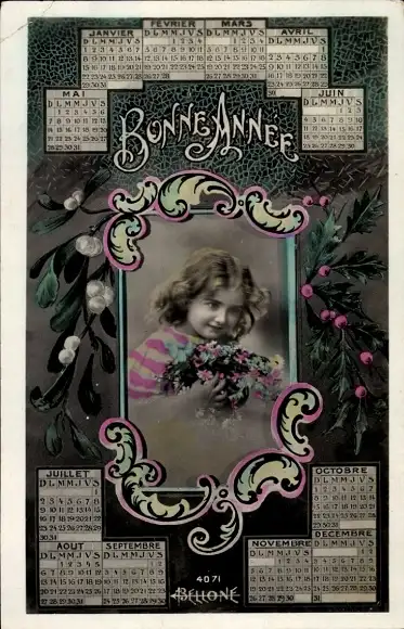 Ak Glückwunsch Neujahr, Mädchen-Portrait, Mistelzweige, Kalender
