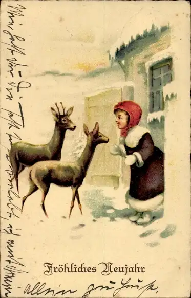 Ak Glückwunsch Neujahr, Mädchen, Reh, Junger Hirsch