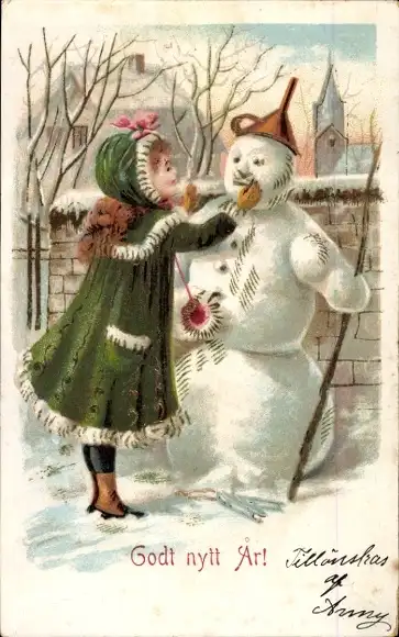 Ak Glückwunsch Neujahr, Mädchen, Schneemann