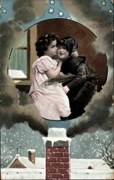 Ak Glückwunsch Neujahr, Mädchen, Schornsteinfeger, Sterne, Dach