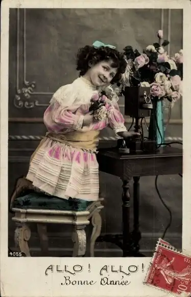 Ak Glückwunsch Neujahr, Mädchen am Telefon, Blumenvase