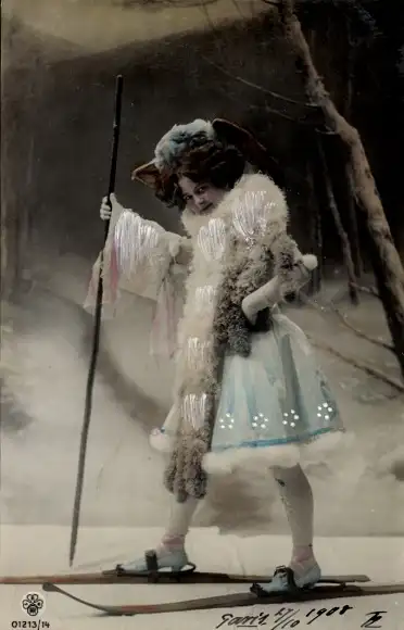 Ak Glückwunsch Neujahr, Mädchen auf Skiern