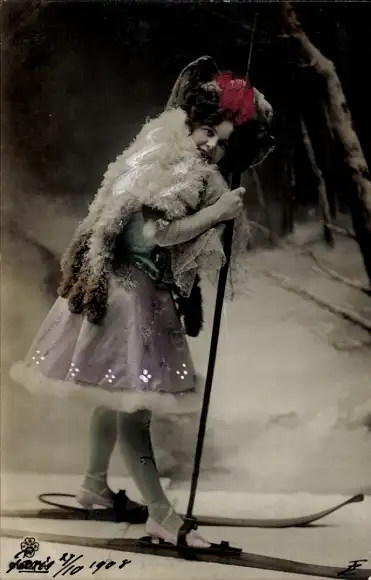 Ak Glückwunsch Neujahr, Mädchen auf Skiern