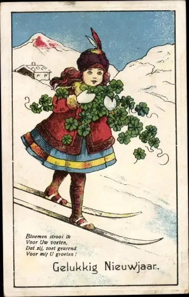 Ak Glückwunsch Neujahr, Mädchen fährt Ski, Glücksklee