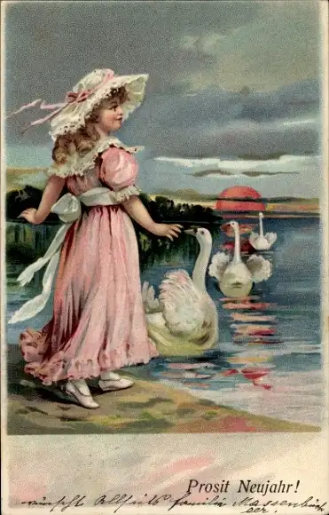 Ak Glückwunsch Neujahr, Mädchen füttert Schwäne