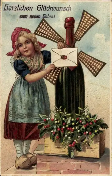 Ak Glückwunsch Neujahr, Mädchen in Tracht, Sektflasche, Stechpalme