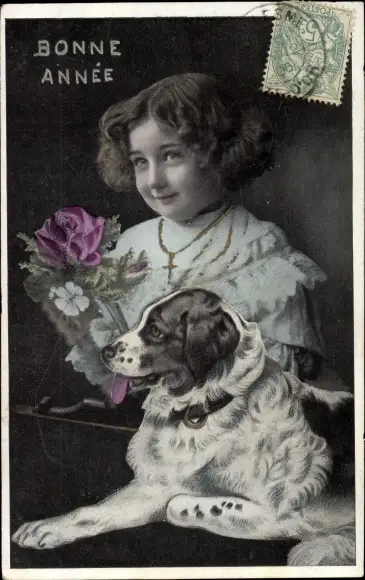Ak Glückwunsch Neujahr, Mädchen mit Blumenstrauß, Hund