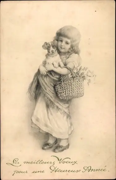 Ak Glückwunsch Neujahr, Mädchen mit Hund, Blumenkorb, Neujahr