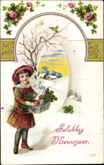 Ak Glückwunsch Neujahr, Mädchen mit Korb, Kleeblatt