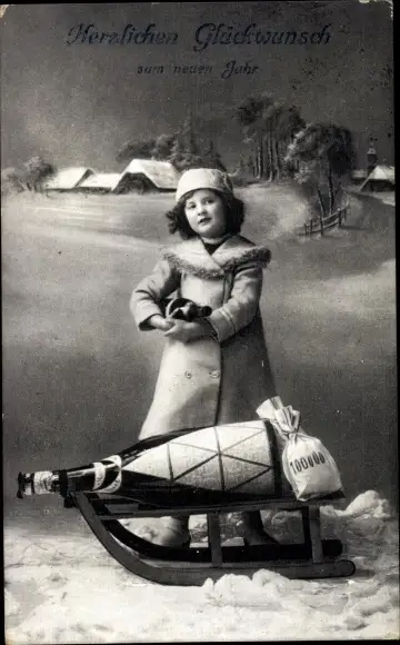 Ak Glückwunsch Neujahr, Mädchen mit Schlitten, Sektflasche, Geldsack