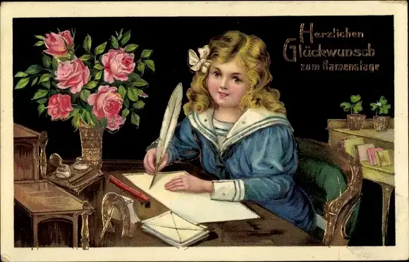 Ak Glückwunsch Neujahr, Mädchen sitzt am Schreibtisch und schreibt einen Brief, Hufeisen, Rosen