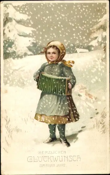 Ak Glückwunsch Neujahr, Mädchen spielt Harmonika, Schnee