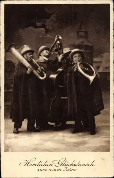 Ak Glückwunsch Neujahr, Männer mit Musikinstrumenten
