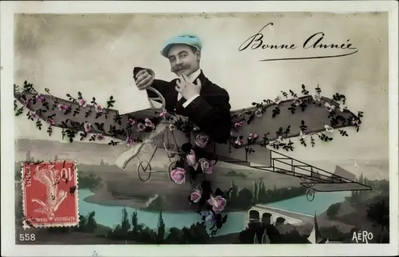 Ak Glückwunsch Neujahr, Mann im Flugzeug, Fotomontage
