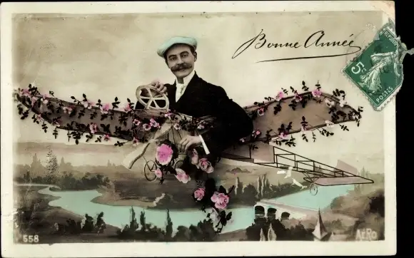 Ak Glückwunsch Neujahr, Mann in einem Flugzeug, Fotomontage