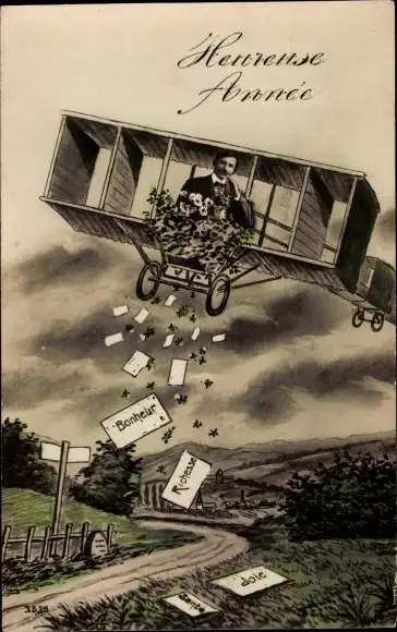 Ak Glückwunsch Neujahr, Mann in einem Flugzeug, Fotomontage