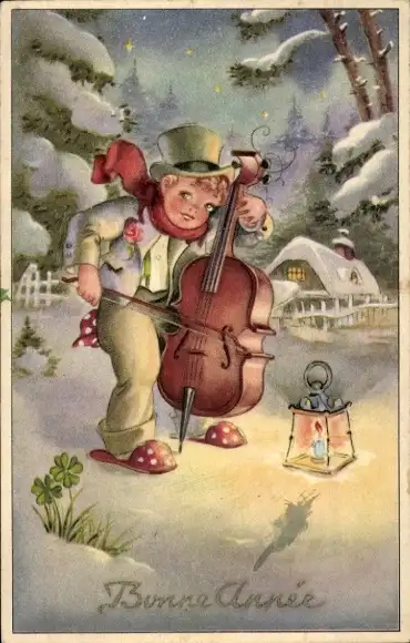 Ak Glückwunsch Neujahr, Mann mit Cello, Laterne, Kleeblätter