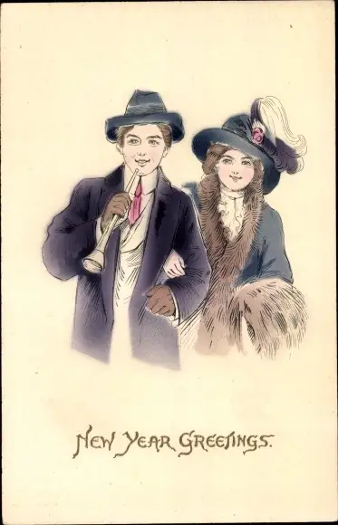 Ak Glückwunsch Neujahr, Mann und Frau in Wintermänteln, Trompete