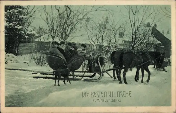 Ak Glückwunsch Neujahr, Personen in einem Schlittengespann