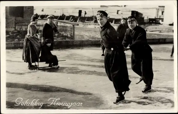Ak Glückwunsch Neujahr, Personen in niederländischen Trachten beim Eislaufen