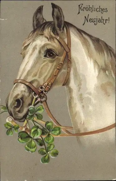 Ak Glückwunsch Neujahr, Pferdekopf, Kleeblatt