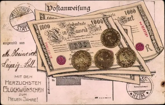 Ak Glückwunsch Neujahr, Postanweisung, Reichsbanknote, Münzen