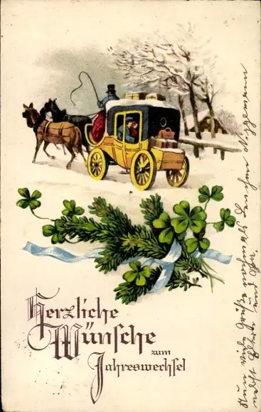 Ak Glückwunsch Neujahr, Postkutsche, Kleeblätter
