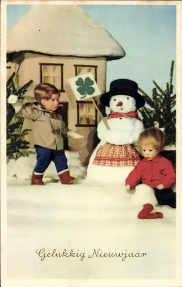 Ak Glückwunsch Neujahr, Puppen mit Schneemann