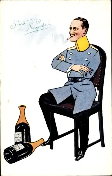 Ak Glückwunsch Neujahr, Rauchender Soldat in Uniform, Sektflaschen
