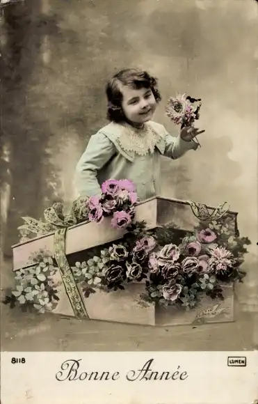 Ak Glückwunsch Neujahr, Schachtel mit Blumen, Kind