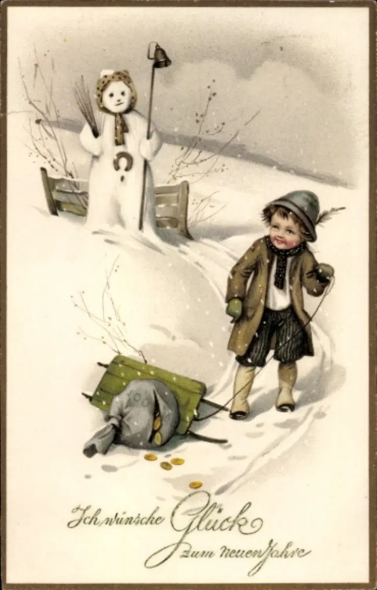 Ak Glückwunsch Neujahr, Schlitten, Geldsack, Schneemann