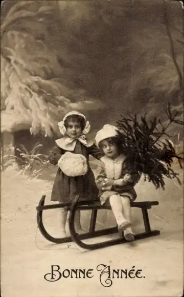 Ak Glückwunsch Neujahr, Schlitten, Kinder