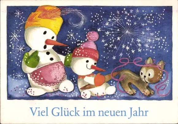 Ak Glückwunsch Neujahr, Schneemänner, Katze