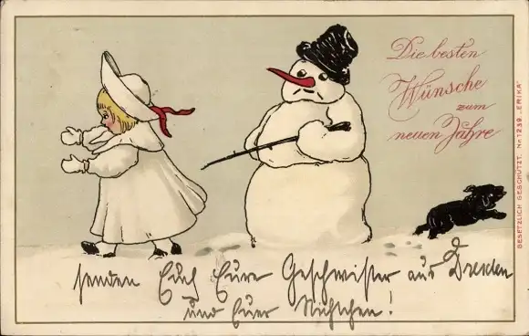 Ak Glückwunsch Neujahr, Schneemann, Mädchen, Hund