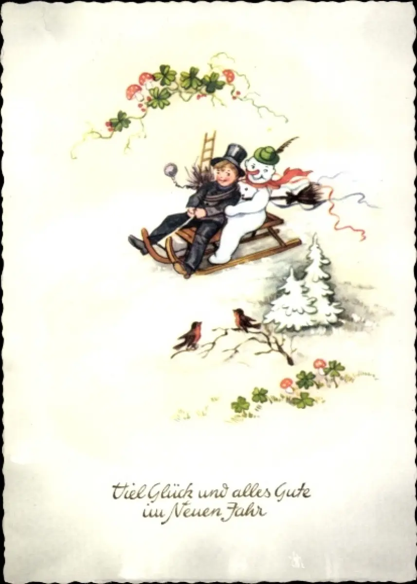 Ak Glückwunsch Neujahr, Schneemann, Schornsteinfeger, Kleeblätter