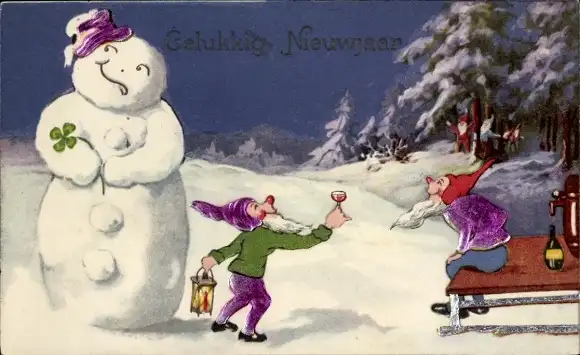 Ak Glückwunsch Neujahr, Schneemann, Zwerge, Wein, Kleeblatt