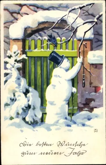 Ak Glückwunsch Neujahr, Schneemann läutet an Gartentor