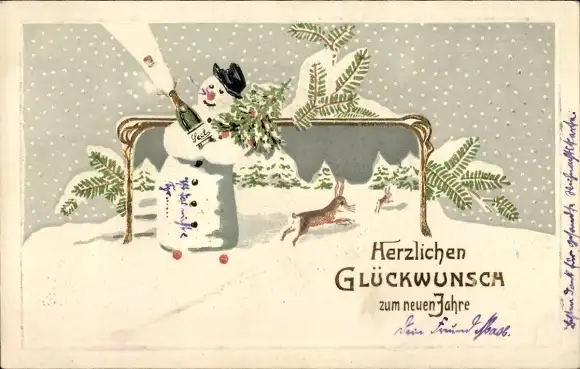 Ak Glückwunsch Neujahr, Schneemann mit Sektflasche
