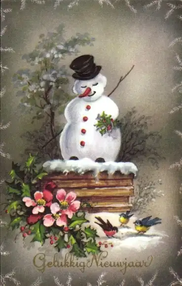 Ak Glückwunsch Neujahr, Schneemann mit Stechpalmenzweigen, Vögel